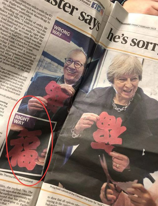 Shanghai, 06/02/2018 (El Pueblo en Línea) - En medio de las complicadas negociaciones del Brexit, el diario London News se mofó de la primera ministra británica Teresa May porque mostró de forma “equivocada” el caracter chino “Fu”, al presentarlo al revés en una pieza recortada en papel, 5 de febrero del 2018.