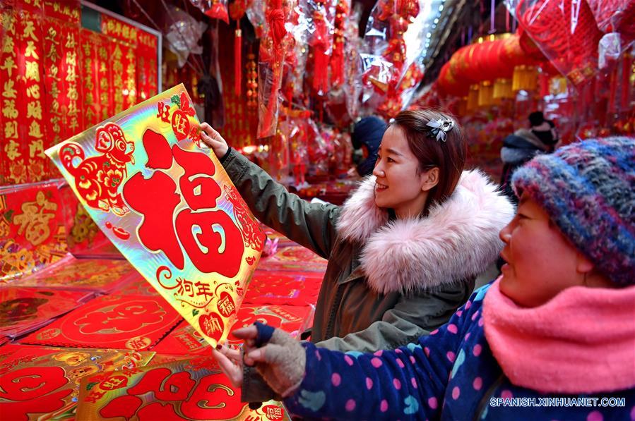 Personas seleccionan coplas y carteles en un mercado previo al Festival de Primavera, en la ciudad de Tangshan, en la provincia de Hebei, en el norte de China, el 5 de febrero de 2018. (Xinhua/Yang Shiyao)