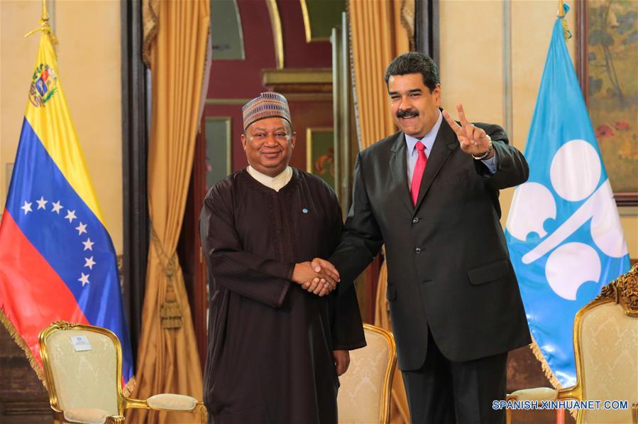 Imagen cedida por la Presidencia de Venezuela, del presidente venezolano, Nicolás Maduro (d), estrechando la mano con el secretario general de la Organización de Países Exportadores de Petróleo (OPEP), Mohammed Barkindo (i), durante su reunión en el Palacio de Miraflores, en Caracas, Venezuela, el 5 de febrero de 2018. De acuerdo con información de la prensa local, Maduro destacó durante la reunión que se reforzarán las medidas que se toman en conjunto con la OPEP para continuar con el acuerdo de recorte firmado por los miembros de la organización, toda vez que los precios del mercado petrolero están en una fase de estabilización, además de informar que propondrá a los integrantes de la OPEP el uso de criptomonedas con respaldo en el crudo. (Xinhua/Presidencia de Venezuela)