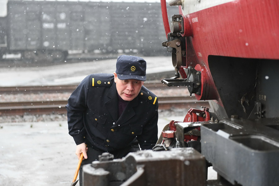 Yu Xiangyang comprueba una locomotora, 31 de enero del 2018. [Foto: Xinhua]