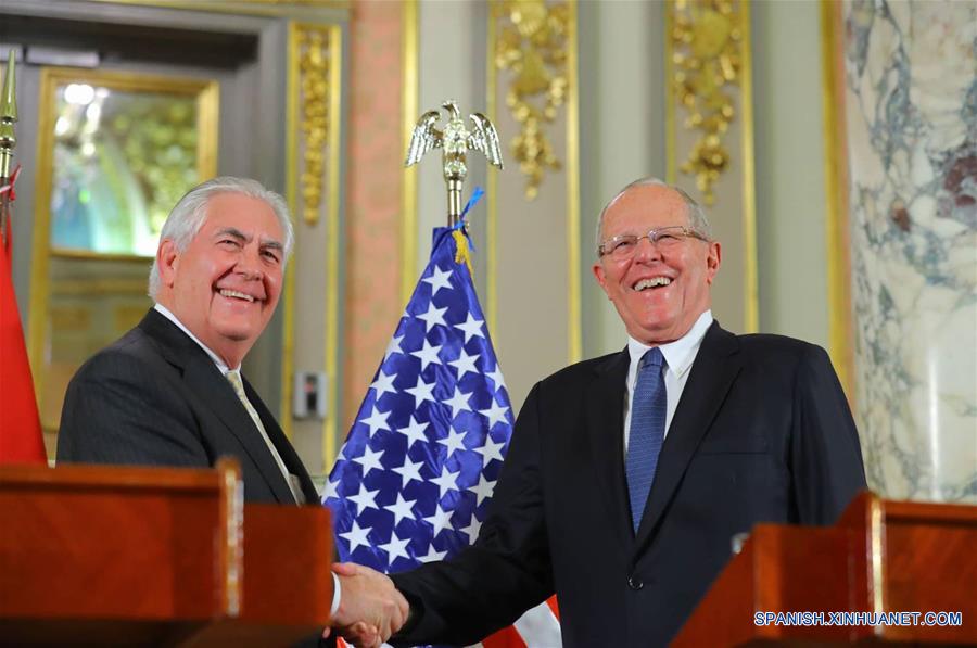El presidente de Perú, Pedro Pablo Kuczynski (d), estrecha la mano con el secretario de Estado de Estados Unidos, Rex Tillerson (i), durante una conferencia de prensa conjunta llevada a cabo en Palacio de Gobierno, en Lima, Perú, el 6 de febrero de 2018. Tillerson arribó el lunes a la capital peruana para una visita de dos días, país donde se encontró el martes con el presidente peruano, Pedro Pablo Kuczynski. El visitante estadounidense tratará en el país sudamericano temas bilaterales y regionales, entre ellos la VIII Cumbre de las Américas que se celebrará en Lima a mediados de abril de 2018. (Xinhua/Prensa Presidencia/ANDINA)