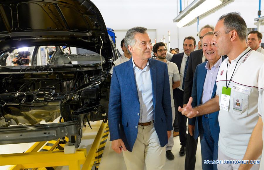 CORDOBA, febrero 7, 2018 (Xinhua) -- El presidente argentino, Mauricio Macri (i), recorre el Complejo Industrial Ferreyra en el marco de la presentación del automóvil Cronos, nuevo modelo de Fiat Chrysler, en Córdoba, Argentina, el 7 de febrero de 2018. En el marco de la presentación del automóvil Cronos, nuevo modelo de Fiat Chrysler que se produce en el Complejo Industrial Ferreyra de Córdoba, Macri dijo que Argentina debe crecer "20 a?os seguidos" para tener "ese país que so?amos y merecemos, haciéndolo todos los días juntos, con la verdad, sin patoterismos (conductas agresivas) ni comportamientos mafiosos extorsivos". (Xinhua/Presidencia/TELAM)