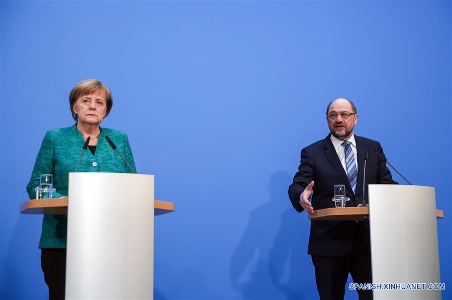 BERLIN, febrero 7, 2018 (Xinhua) -- La canciller de Alemania y líder de la Unión Cristianodemócrata (CDU) alemana, Angela Merkel (i), y el líder de la Unión Socialcristiana (CSU) alemana, Martin Schulz (d), participan durante una conferencia de prensa conjunta en la sede de la CDU, en Berlín, Alemania, el 7 de febrero de 2018. Los tres partidos alemanes alcanzaron un acuerdo sobre una "gran coalición" luego de difíciles negociaciones, informó la prensa local la ma?ana del miércoles. (Xinhua/Shan Yuqi)