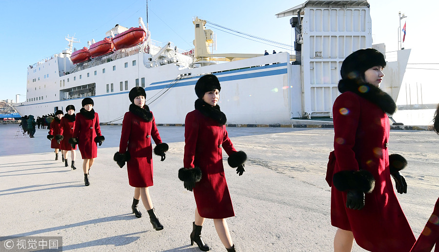 Los miembros de la compa?ía artística Samjiyon de la República Popular Democrática de Corea llegan al puerto Mukho, en Dongae, en vísperas de iniciarse los XXIII Juegos Olímpicos de Invierno en Pyeongchang, Corea del Sur, 7 de febrero del 2018. [Foto: VCG]