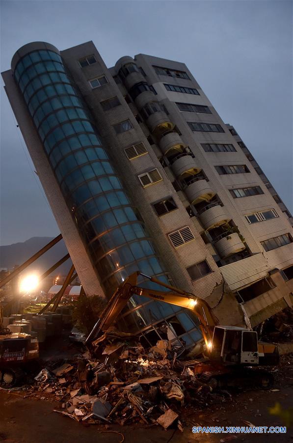 HUALIEN, febrero 8, 2018 (Xinhua) -- Vista del edificio Yun Men Tusi Ti da?ado, en Hualien, Taiwan, en el sureste de China, el 8 de febrero de 2018. El fuerte sismo que ocurrió en el distrito de Hualien de Taiwan ha dejado al menos 10 personas muertas, 272 heridos y siete desaparecidos. De las víctimas, cuatro eran de la parte continental china y una de Filipinas. Tres de las víctimas, todas mujeres, fueron encontradas entre las ruinas del edificio Yun Men Tusi Ti da?ado, y una más, que había sido rescatada allí mismo el miércoles, falleció esa noche. Los socorristas dijeron que otros cinco turistas de la parte continental, cuatro adultos y un ni?o, continúan atrapados en el mismo edificio. (Xinhua/Yue Yuewei)
