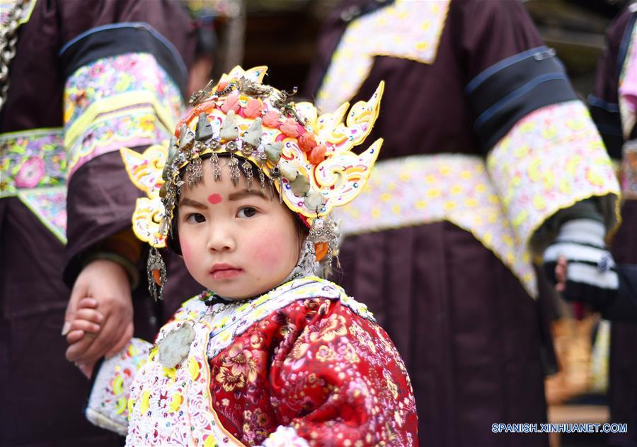 Un ni?o del grupo étnico dong portando un traje típico asiste a una celebración para recibir el Festival de Primavera en la aldea de Cenle del condado de Rongjiang, en la provincia de Guizhou, en el suroeste de China, el 7 de febrero de 2018. (Xinhua/Wang Bingzhen)