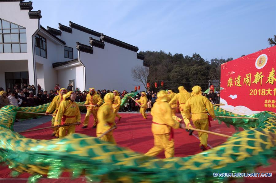 ZHEJIANG, febrero 8, 2018 (Xinhua) -- Actores interpretan la danza del dragón en el día de Xiaonian, en la villa de Dazhu del municipio de Xiaofeng del condado de Anji, provincia de Zhejiang, en el este de China, el 8 de febrero de 2018. Xiaonian, el día 23 o 24 del mes 12 del calendario lunar chino, marca el comienzo de la cuenta regresiva del Festival de Primavera. Un total de 36 espectáculos culturales serán puestos en escena en el condado. (Xinhua/Weng Xinyang)
