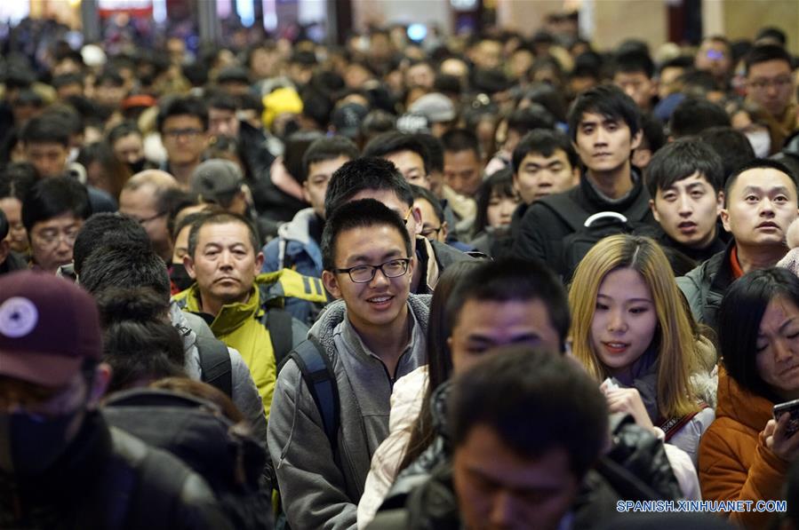 Imagen del 9 de febrero de 2018 de pasajeros esperando para registrarse en la Estación de Ferrocarril de Beijing, en Beijing, capital de China. El ferrocarril chino recibe un frenesí de viajes mientras el Festival de Primavera se acerca. La temporada alta de viajes del Festival de Primavera 2018, conocida como el Chunyun, comenzó el 1 de febrero y durará hasta el 12 de marzo. Se espera que aprximadamente 2.98 mil millones de viajes sean realizados durante el Chunyun. El Festival de Primavera, o A?o Nuevo Lunar chino se celebra el 16 de febrero este a?o. (Xinhua/Xing Guangli)