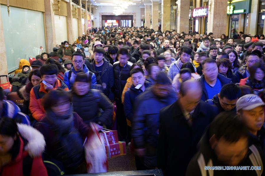 Imagen del 9 de febrero de 2018 de pasajeros esperando en fila para registrarse en la Estación del Ferrocarril de Beijing, en Beijing, capital de China. El ferrocarril chino recibe un frenesí de viajes mientras el Festival de Primavera se acerca. La temporada alta de viajes del Festival de Primavera 2018, conocida como el Chunyun, comenzó el 1 de febrero y durará hasta el 12 de marzo. Se espera que aprximadamente 2.98 mil millones de viajes sean realizados durante el Chunyun. El Festival de Primavera, o A?o Nuevo Lunar chino se celebra el 16 de febrero este a?o. (Xinhua/Xing Guangli)
