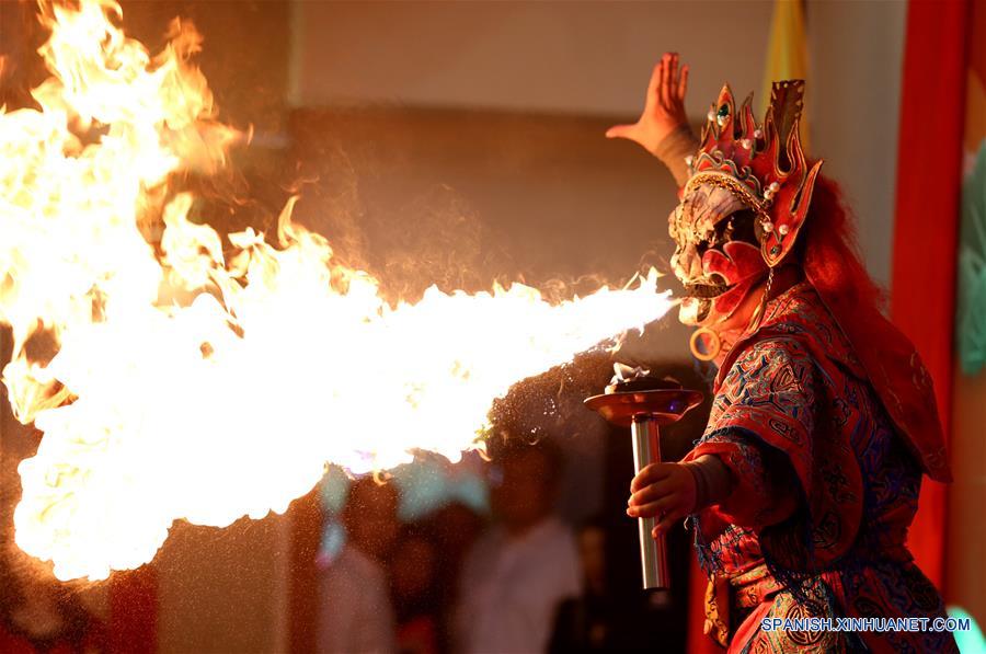 Un artista actúa durante una celebración llevada a cabo por el próximo A?o Nuevo Lunar chino, en Yangón, Myanmar, el 10 de febrero de 2018. (Xinhua/U Aung)