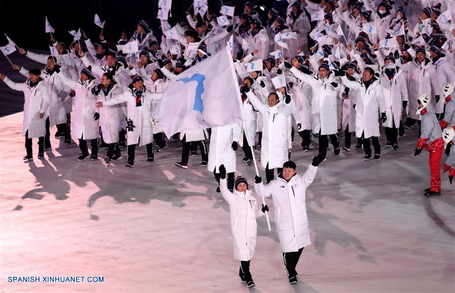 Lo atletas, vestidos con chaquetas acolchadas largas de color blanco, caminaron tras la bandera que tiene una silueta azul de la península de Corea sobre fondo blanco. Los atletas portaban en la mano derecha peque?as banderas unificadas mientras sonreían frente a los 35.000 espectadores en el estadio.