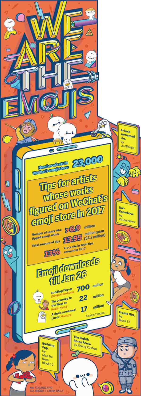 Según WeChat, más de 690.000 usuarios regalaron propinas a los artistas de emoji en 2017, generaron casi 14 millones de yuanes en total, un 13% más a?o con a?o.