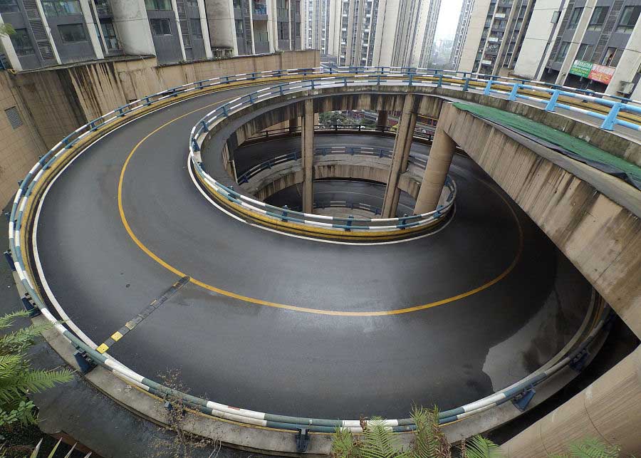 Interesante estacionamiento espiral de cinco pisos, situado en una zona residencial de Chongqing, 11 de febrero del 2018. [Foto: VCG]