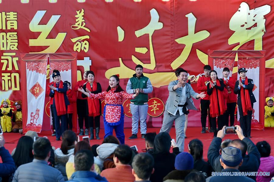 Imagen del 11 de febrero de 2018, de artistas participando en la Gala del Festival de Primavera del condado de Yonghe, en la provincia de Shanxi, en el norte de China. Una gala para celebrar el próximo Festival de Primavera fue presentada por residentes locales. (Xinhua/Cao Yang)