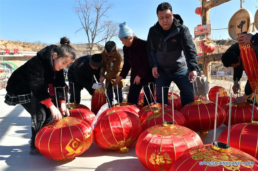 Imagen del 11 de febrero de 2018, de residentes ordenando linternas rojas para la Gala del Festival de Primavera del condado de Yonghe, en la provincia de Shanxi, en el norte de China. Una gala para celebrar el próximo Festival de Primavera fue presentada por residentes locales. (Xinhua/Cao Yang)