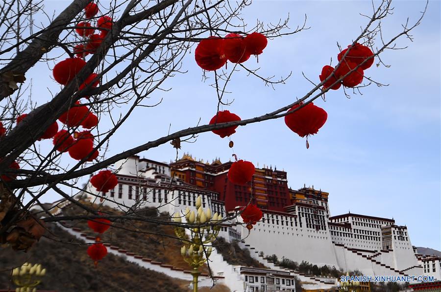 Vista de decoraciones colgadas de un árbol para celebrar el Festival de Primavera y el A?o Nuevo Tibetano, frente al Palacio de Potala, en Lhasa, capital de la región autónoma del Tíbet, en el suroeste de China, el 12 de febrero de 2018. (Xinhua/Chogo)