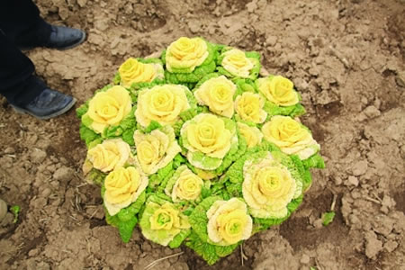 Nanjing, Jiangsu, 14/02/2018(El Pueblo en Línea) - Las "rosas" amarillas vendidas en línea para el Día de San Valentín están delicadamente envueltas y decoradas con cintas y otras flores coloridas. Lo que muchos jóvenes chinos que reservan rosas quizás no saben es que estas "flores" en realidad son un nuevo tipo de col que se parece la flor más romántica.