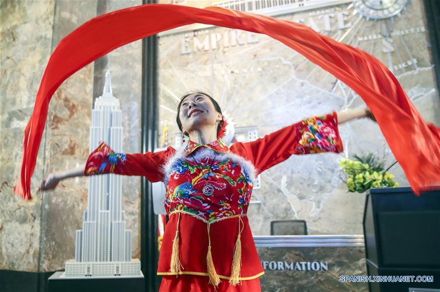 Una bailarina realiza una presentación previo a la ceremonia de encendido ceremonial en honor del Festival de Primavera, en el Edificio Empire State, en Nueva York, Estados Unidos, el 13 de febrero de 2018. La cima del Edificio Empire State en Manhattan, Nueva York, será iluminada en rojo y dorado al atardecer del martes y jueves, en celebración del A?o Nuevo Lunar chino que este a?o ocurre el 16 de febrero. (Xinhua/Wang Ying)