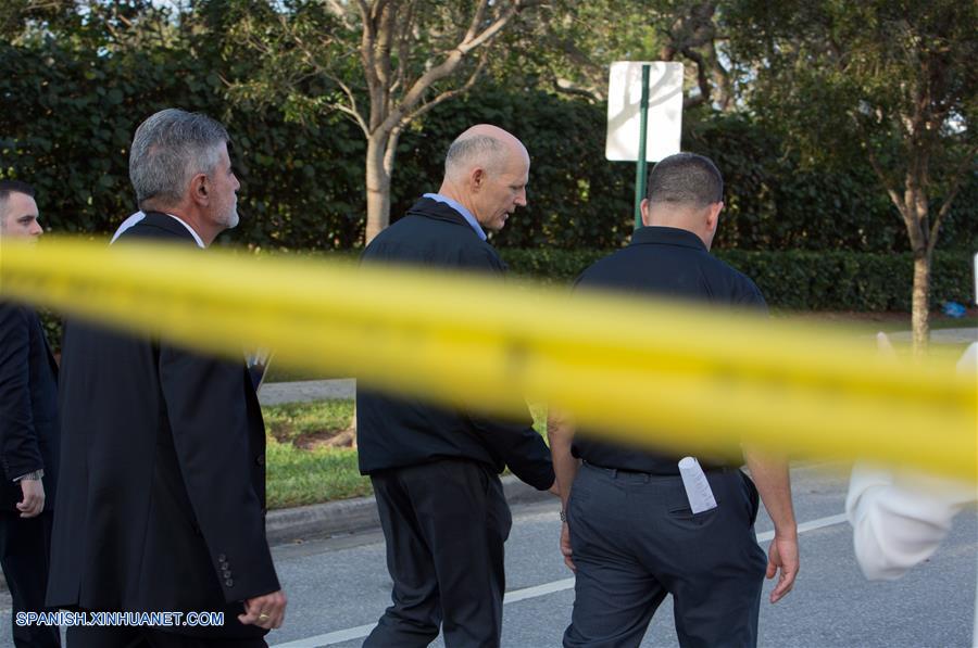 FLORIDA, febrero 15, 2018 (Xinhua) -- El gobernador de Florida, Rick Scott (2-d), inspecciona el lugar de un tiroteo masivo en la escuela secundaria Marjory Stoneman Douglas, en Parkland, en el condado de Broward, estado de Florida, Estados Unidos, el 15 de febrero de 2018. Un tiroteo ocurrido el miércoles en una escuela del estado de Florida dejó 17 muertos, según las autoridades estadounidenses. El incidente ocurrió en la escuela secundaria Marjory Stoneman Douglas en Parkland, al norte de Miami, una ciudad recién listada como una de las diez ciudades más seguras en Florida. (Xinhua/Monica McGivern)