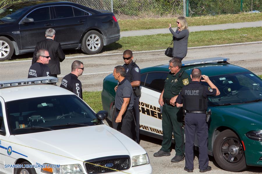 FLORIDA, febrero 15, 2018 (Xinhua) -- Oficiales de policía montan guardia cerca de la escuela secundaria Marjory Stoneman Douglas, en Parkland, en el condado de Broward, estado de Florida, Estados Unidos, el 15 de febrero de 2018. Un tiroteo ocurrido el miércoles en una escuela del estado de Florida dejó 17 muertos, según las autoridades estadounidenses. El incidente ocurrió en la escuela secundaria Marjory Stoneman Douglas en Parkland, al norte de Miami, una ciudad recién listada como una de las diez ciudades más seguras en Florida. (Xinhua/Monica McGivern)