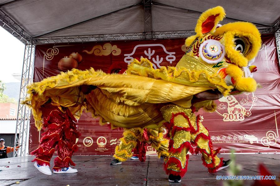 Artistas realizan la Danza del León en un evento para celebrar el A?o Nuevo Lunar chino, en el municipio de Chacao, Caracas, Venezuela, el 18 de febrero de 2018. El evento, encabezado por el embajador de China en Venezuela, Li Baorong, exhibió platillos típicos, vestimenta tradicional y presentaciones artísticas de China. De acuerdo con la tradición china, el A?o Nuevo chino inició el 16 de febrero este a?o, y está dedicado al "Perro de Tierra", animal que significa carisma y bondad.(Xinhua/Boris Vergara)