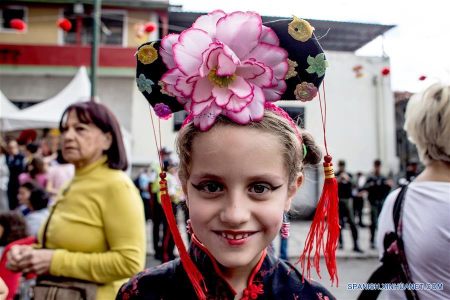 CARACAS, febrero 18, 2018 (Xinhua) -- Una ni?a participa en un evento para celebrar el A?o Nuevo Lunar chino, en el municipio de Chacao, Caracas, Venezuela, el 18 de febrero de 2018. El evento, encabezado por el embajador de China en Venezuela, Li Baorong, exhibió platillos típicos, vestimenta tradicional y presentaciones artísticas de China. De acuerdo con la tradición china, el A?o Nuevo chino inició el 16 de febrero este a?o, y está dedicado al "Perro de Tierra", animal que significa carisma y bondad.(Xinhua/Boris Vergara)