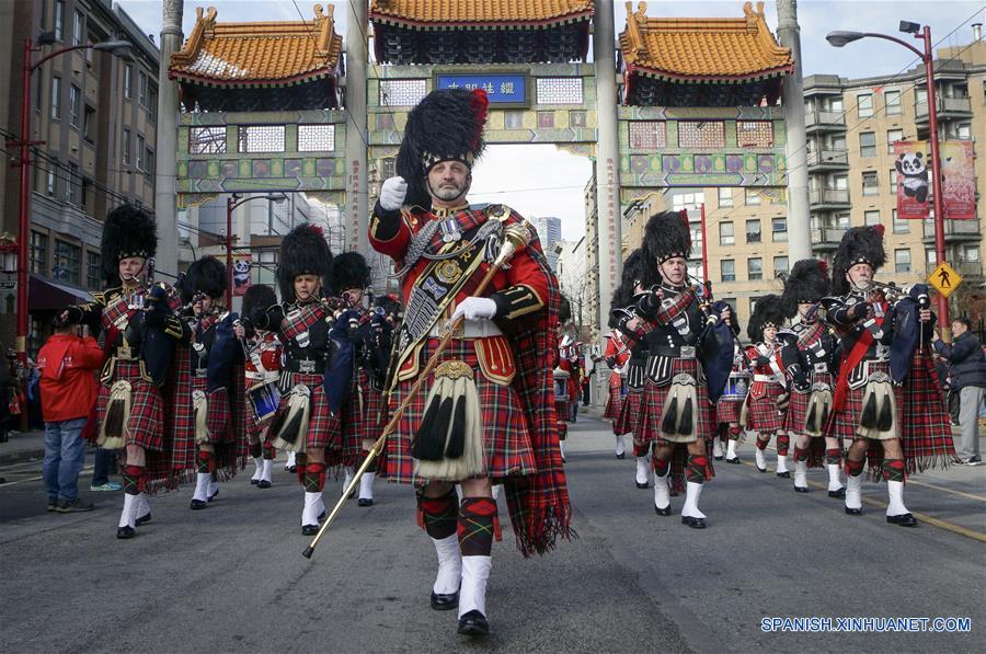 Una banda militar participa durante el 45 Desfile de A?o Nuevo chino en Vancouver, Canadá, el 18 de febrero de 2018. Participantes desfilaron el domingo en las calles del barrio chino de Vancouver para festejar el A?o del Perro, atrayendo a más de 100,000 espectadores. (Xinhua/Liang Sen)