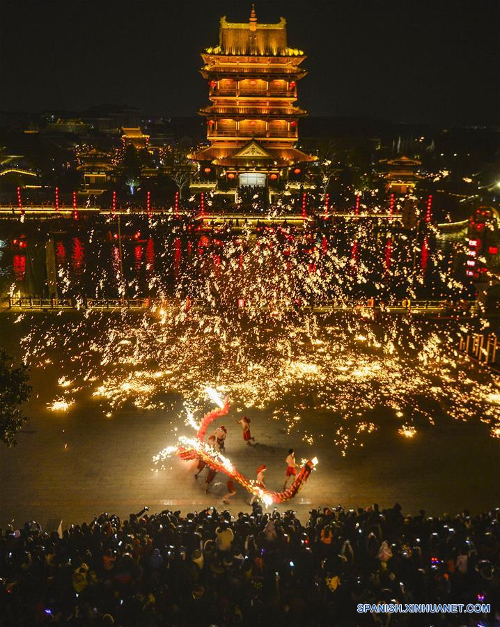 HEBEI, febrero 18, 2018 (Xinhua) -- Imagen del 17 de febrero de 2018, de personas observando una Danza de Dragón con fuego en un ba?o de virutas de hierro hirviendo en Tai'erzhuang, en la provincia de Shangdong, en el este de China. (Xinhua/Gao Qimin)