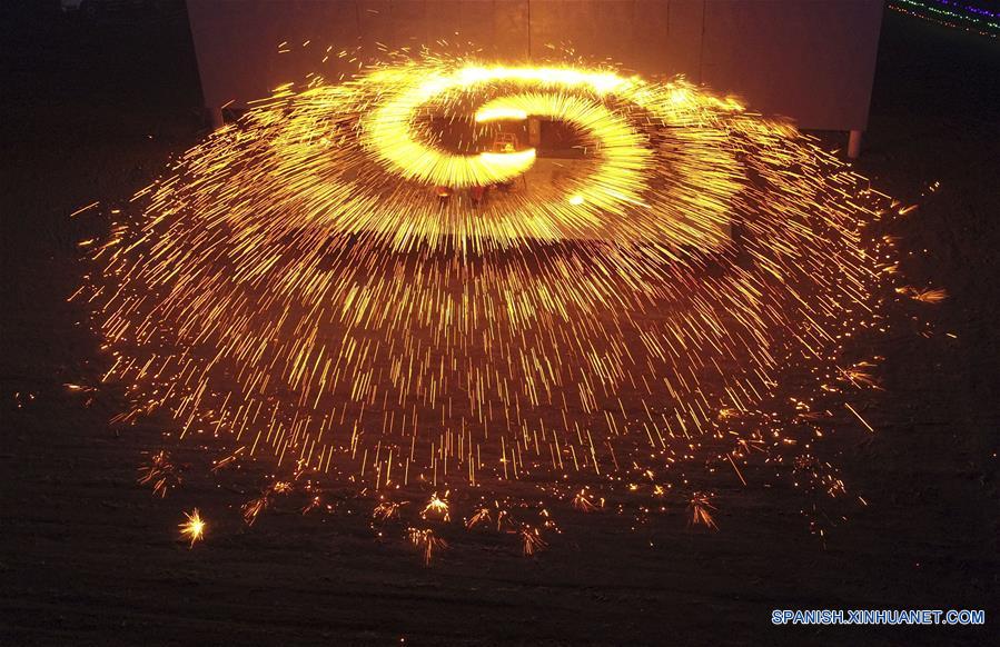 HEBEI, febrero 18, 2018 (Xinhua) -- Imagen del 17 de febrero de 2018, de un artista rociando virutas de hierro ardientes durante una feria de templo en Zunhua, en la provincia de Hebei, en el norte de China. (Xinhua/Liu Mancang)