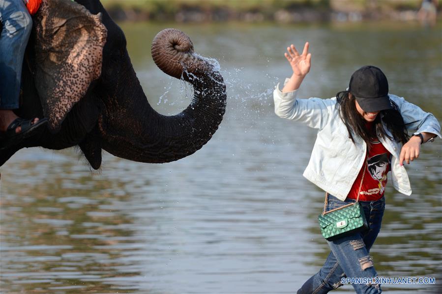 SAYABULY, febrero 17, 2018 (Xinhua) -- Una turista juega con un elefante en el Festival de Elefantes, en la provincia de Sayabuly, Laos, el 17 de febrero de 2018. El Festival de Elefantes se llevó a cabo en la norte?a provincia laosiana de Sayabuly con 69 elefantes asistiendo a las actividades durante el festival. (Xinhua/Liu Ailun)
