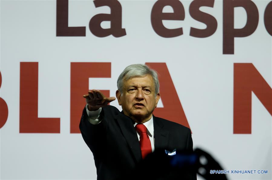 CIUDAD DE MEXICO, febrero 18, 2018 (Xinhua) -- Andrés Manuel López Obrador toma protesta como candidato a la presidencia de México por el partido Movimiento Regeneración Nacional (MORENA), durante la Asamblea Nacional Electiva, en la Ciudad de México, capital de México, el 18 de febrero de 2018. (Xinhua/Francisco Ca?edo)