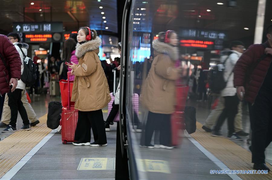 BEIJING, febrero 21, 2018 (Xinhua) -- Pasajeros llegan a la Estación del Ferrocarril de Beijing Sur, en Beijing, capital de China, el 21 de febrero de 2018. El número de pasajeros por tren podría aumentar el miércoles, ya que es la última jornada de las vacaciones de una semana de duración por el A?o Nuevo Lunar. Unos 11,8 millones de viajes se harán en la red ferroviaria de China, lo que representa una subida interanual del 7,6 por ciento, ya que la gente regresa de sus pueblos natales. El sistema ferroviario a?adirá 1.091 trenes para satisfacer la demanda de viaje, de acuerdo con la Corporación de Ferrocarriles. (Xinhua/Xing Guangli)