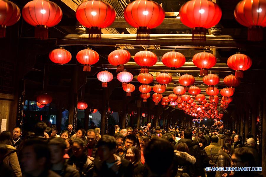 HUBEI, febrero 21, 2018 (Xinhua) -- Imagen del 20 de febrero de 2018 de personas caminando por un puente del condado de Xuan'en, provincia de Hubei, en el centro de China. Espectáculos de luces se llevaron a cabo en el lugar para celebrar el Festival de Primavera. (Xinhua/Song Wen)