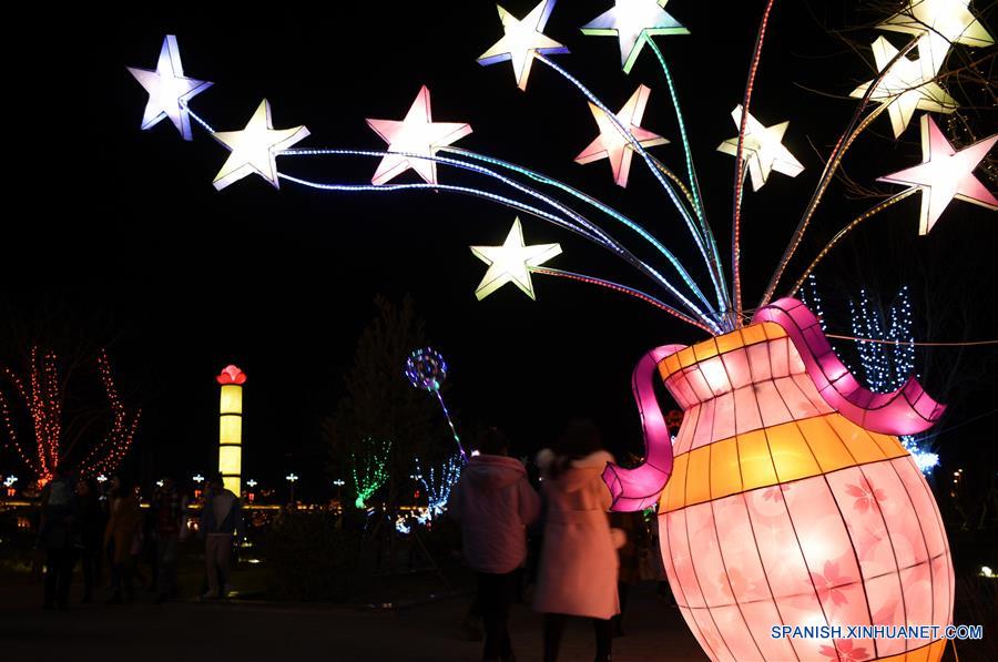 Imagen del 20 de febrero de 2018 de personas visitando un espectáculo de luz llevado a cabo para la celebración del A?o Nuevo Lunar, en Bayan Nur en la Región Autónoma de Mongolia Interior, en el norte de China. (Xinhua/Zhi Maosheng)