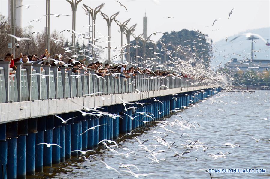 Turistas observan y alimentan a las gaviotas de cabeza negra cerca del Lago Dianchi en Kunming, provincia de Yunnan, en el suroeste de China, el 21 de febrero de 2018. Cada a?o en el oto?o y el invierno las gaviotas de cabeza negra vuelan a Kunming para un clima más cálido. (Xinhua/Hu Chao)