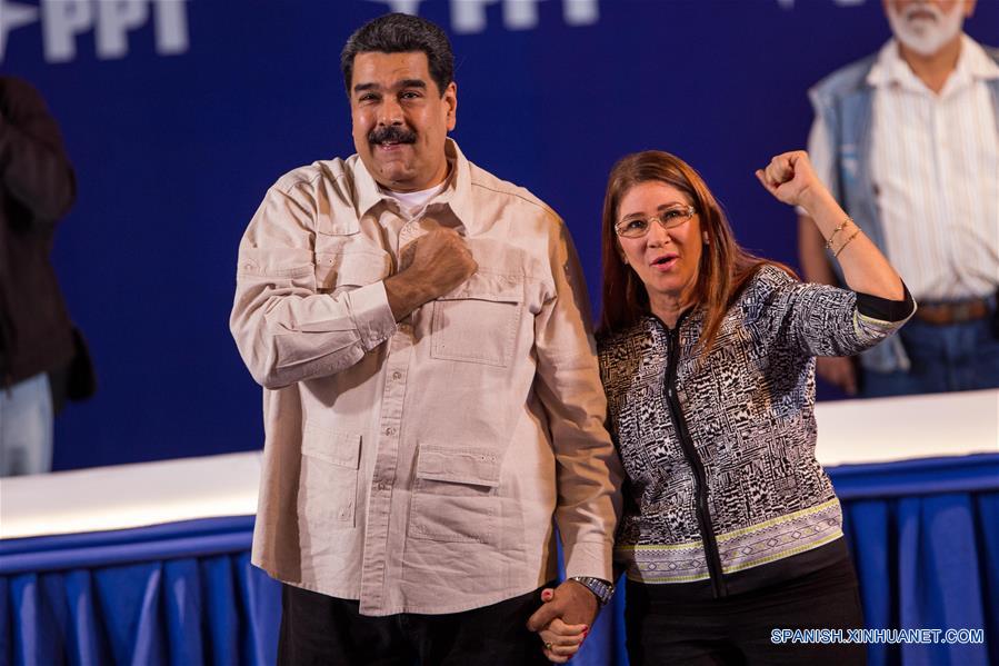 CARACAS, febrero 21, 2018 (Xinhua) -- El presidente venezolano, Nicolás Maduro (i), acompa?ado por su esposa Cilia Flores (d), participa durante una reunión con integrantes del partido Patria Para Todos (PPT), en el Teatro Nacional en Caracas, Venezuela, el 21 de febrero de 2018. El presidente venezolano, Nicolás Maduro, informó el miércoles que propondrá a la Asamblea Nacional Constituyente (ANC) que se realicen comicios para renovar los consejos legislativos regionales y los 335 consejos municipales, a la par de las elecciones presidenciales del 22 de abril. Maduro declaró que está de acuerdo con la propuesta hecha por el primer vicepresidente del Partido Socialista Unido de Venezuela (PSUV), Diosdado Cabello, quien propondrá que el próximo 22 de abril también se elija una nueva Asamblea Nacional. (Xinhua/Str)