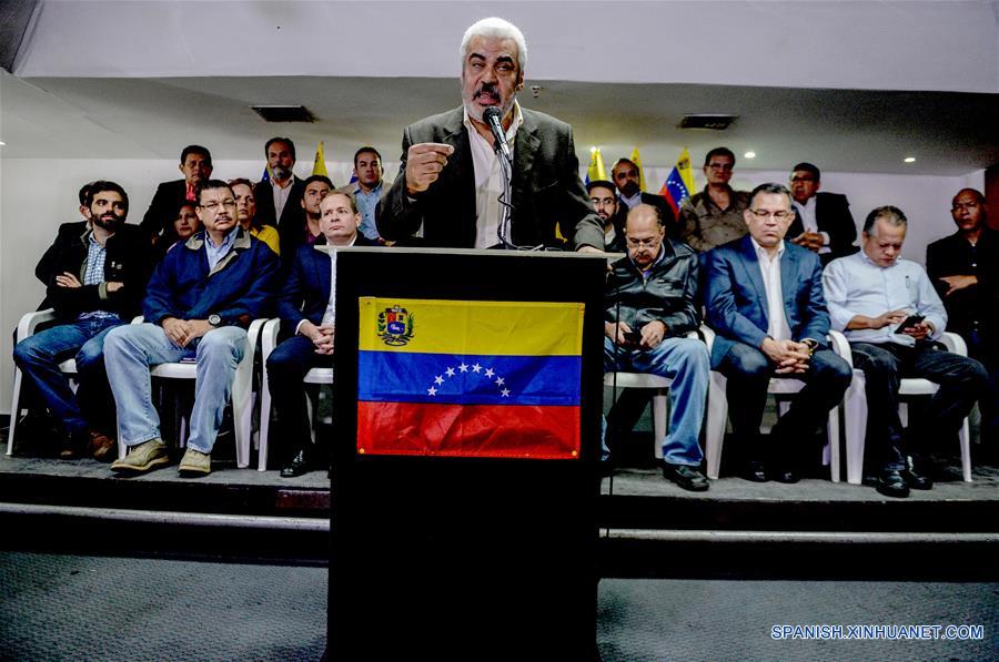 CARACAS, febrero 21, 2018 (Xinhua) -- El vocero de la opositora alianza Mesa de la Unidad Democrática (MUD) de Venezuela, el diputado Angel Oropeza (frente), participa durante una conferencia de prensa, en Caracas, Venezuela, el 21 de febrero de 2018. La opositora alianza MUD de Venezuela anunció el miércoles que no participará en las elecciones presidenciales del próximo 22 de abril, a menos que se den las "condiciones previstas en la ley". (Xinhua/Str)