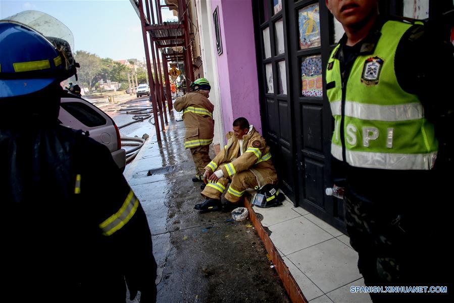 Un integrante del Cuerpo de Bomberos de Panamá descansa después de sofocar un incendio en el barrio de San Felipe, en la Ciudad de Panamá, en Panamá, el 21 de febrero de 2018. De acuerdo con información de la prensa local, alrededor de 55 familias resultaron afectadas luego del incendio registrado en la casa del barco, conocida como "Casa Boyacá", una de las estructuras emplemáticas del Casco Antiguo. (Xinhua/Mauricio Valenzuela)