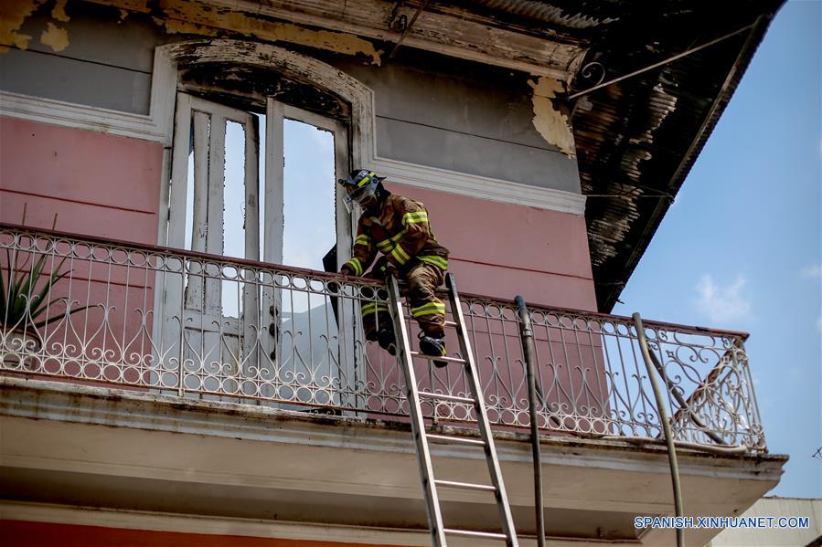 Un integrante del Cuerpo de Bomberos de Panamá trabaja en el lugar donde se registró un incendio, en el barrio de San Felipe, en la Ciudad de Panamá, en Panamá, el 21 de febrero de 2018. De acuerdo con información de la prensa local, alrededor de 55 familias resultaron afectadas luego del incendio registrado en la casa del barco, conocida como "Casa Boyacá", una de las estructuras emplemáticas del Casco Antiguo. (Xinhua/Mauricio Valenzuela)