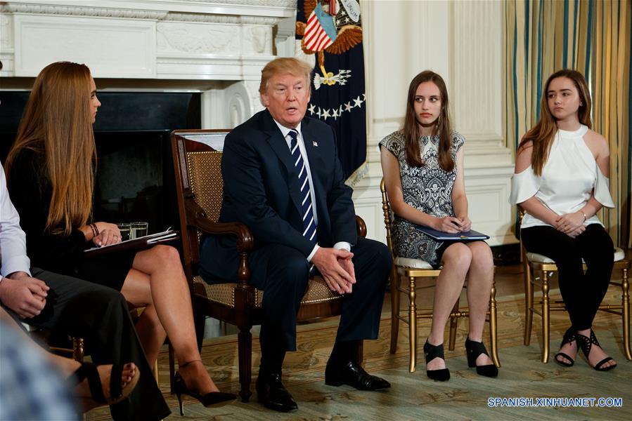 El presidente estadounidense Donald Trump (2-i), participa durante una sesión de escucha sobre seguridad escolar, en la Casa Blanca, en Washington D.C., Estados Unidos, el 21 de febrero de 2018. El presidente de EEUU, Donald Trump, prometió estrictas verificaciones de antecedentes y controles de salud mental para los compradores de armas, durante una reunión en la Casa Blanca el miércoles con supervivientes y familias de víctimas de tiroteos en centros escolares del país norteamericano. (Xinhua/Ting Shen)
