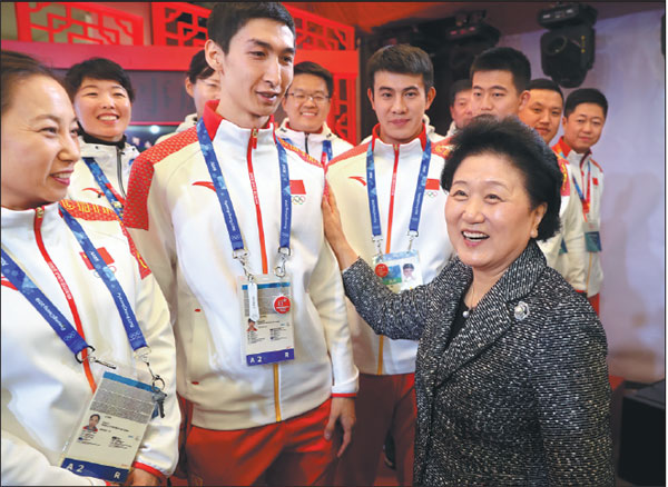 La viceprimer ministra Liu Yandong saluda al atleta chino Wu Dajing, ganador de la medalla de oro en los 500 metros de patinaje masculino de velocidad en pista corta durante los Juegos de Invierno de PyeongChang, en República de Corea. Liu, como representante especial del presidente Xi Jinping, asistió a la ceremonia de clausura de los Juegos Olímpicos de Invierno y se reunió con autoridades del deporte e integrantes de la delegación china. (Foto: Feng Yongbin)
