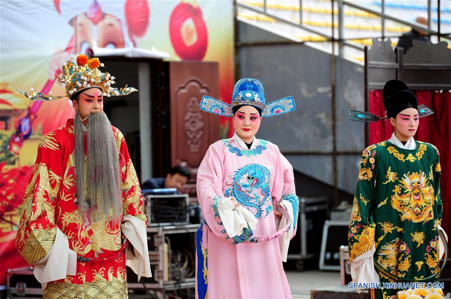Actores interpretan la ópera Qin para saludar a la primavera en una plaza en el condado de Huangling, provincia de Shaanxi, en el noroeste de China, el 27 de febrero de 2018. (Xinhua/Zhang Bowen)