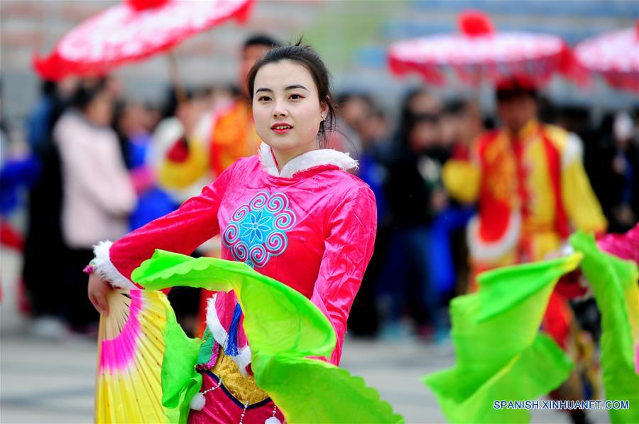 SHAANXI, febrero 27, 2018 (Xinhua) -- Ejecutantes interpretan la danza yangko para saludar a la primavera en una calle en el condado de Huangling, provincia de Shaanxi, en el noroeste de China, el 27 de febrero de 2018. (Xinhua/Zhang Bowen)
