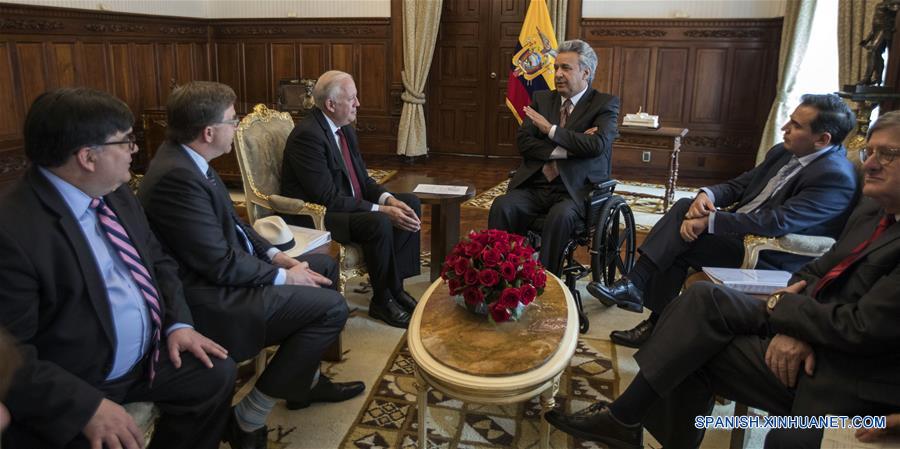 El presidente de Ecuador, Lenín Moreno (3-d), sostiene una reunión con el subsecretario de Estado para Asuntos Políticos de Estados Unidos, Thomas A. Shannon (3-i), en el Despacho Protocolar del Palacio de Carondelet, en Quito, capital de Ecuador, el 27 de febrero de 2018. El presidente ecuatoriano, Lenín Moreno, recibió el martes en el Palacio de Gobierno al subsecretario de Estado para Asuntos Políticos de Estados Unidos, Thomas A. Shannon, quien cumple una visita para tratar asuntos de la relación bilateral. En el encuentro participaron el embajador de Estados Unidos en Quito, Todd Chapman, y el embajador ecuatoriano en Washington, Francisco Carrión, según información difundida por la Presidencia ecuatoriana. (Xinhua/Santiago Armas)