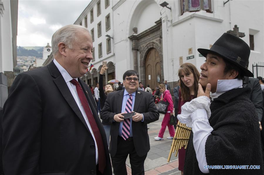 El subsecretario de Estado para Asuntos Políticos de Estados Unidos, Thomas A. Shannon (i), conversa con un residente ecuatoriano luego de asistir a una reunión con el presidente de Ecuador, Lenín Moreno, en el Palacio de Carondelet, en Quito, capital de Ecuador, el 27 de febrero de 2018. El presidente ecuatoriano, Lenín Moreno, recibió el martes en el Palacio de Gobierno al subsecretario de Estado para Asuntos Políticos de Estados Unidos, Thomas A. Shannon, quien cumple una visita para tratar asuntos de la relación bilateral. En el encuentro participaron el embajador de Estados Unidos en Quito, Todd Chapman, y el embajador ecuatoriano en Washington, Francisco Carrión, según información difundida por la Presidencia ecuatoriana. (Xinhua/Santiago Armas)