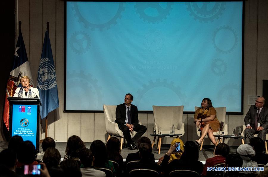 La presidenta de Chile, Michelle Bachelet (i), pronuncia un discurso durante la inauguración del IV Foro Global Empresas por la Igualdad de Género: el Futuro del Trabajo en la Agenda 2030", en Santiago, capital de Chile, el 27 de febrero de 2018. El IV Foro Global Empresas por la Igualdad de Género, es un evento gestionado por la Organización Internacional del Trabajo (OIT) en alianza con la Entidad de la Organización de las Naciones Unidas para la Igualdad de Género y el Emprendimiento de la Mujer (ONU Mujeres), el Programa de Naciones Unidas para el Desarrollo (PNUD) y el Ministerio de la Mujer de Chile. El foro reunirá más de 400 líderes empresariales, gobiernos, academias, sindicatos y sociedad civil de más de 25 países, con el propósito de compartir prácticas innovadoras para reducir las brechas de género en el lugar de trabajo y destacar el rol del sector privado como un jugador clave para el avance de la igualdad de género, el empoderamiento de la mujer y el logro de ambientes de trabajo más inclusivos, que contribuyan al logro de la Agenda 2030, de acuerdo con información de la prensa local. (Xinhua/Jorge Villegas)