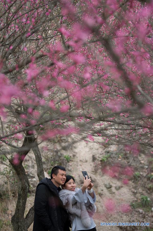 Turistas posan para una "selfie" bajo los árboles de cerezo en el punto escénico de Jiuhukeng en el condado de Xianju, provincia de Zhejiang, en el este de China, el 27 de febrero de 2018. (Xinhua/Weng Xinyang)