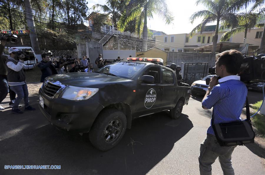 EL CHIMBO, 28 febrero, 2018 (Xinhua) -- Militares hondure?os salen en caravana con la detenida ex primera dama de Honduras, Rosa Elena Bonilla, esposa del ex presidente hondure?o Porfirio Lobo, en la aldea de El Chimo, en el noreste de Tegucigalpa, capital de Honduras, el 28 de febrero de 2018. La ex primera dama de Honduras, Rosa Elena Bonilla de Lobo, fue capturada el miércoles en su casa en Tegucigalpa durante un operativo de la Policía Militar, se?alada de malversación de fondos públicos, informó el Ministerio Público. Las autoridades capturaron también a su cu?ado, Mauricio Mora, vinculado a Rosa Elena por la sustracción de unos 500.000 dólares estadounidenses de la cuenta de la oficina de la ex primera dama, que fueron transferidos a cuentas personales a pocos días de culminar la gestión. El Ministerio Público conoció de la denuncia desde el 2017 y el Tribunal Superior de Cuentas (TSC) investiga a Bonilla debido a la compra irregular de zapatos por un monto de unos 300.000 dólares estadounidenses. De acuerdo con el reporte, desde las 06:00 hora local (12:00 GMT) del miércoles se desplegó un amplio operativo en la casa del ex presidente Porfirio Lobo Sosa (2010-2014) en El Chimbo en el noreste de Tegucigalpa. (Xinhua/Rafael Ochoa)