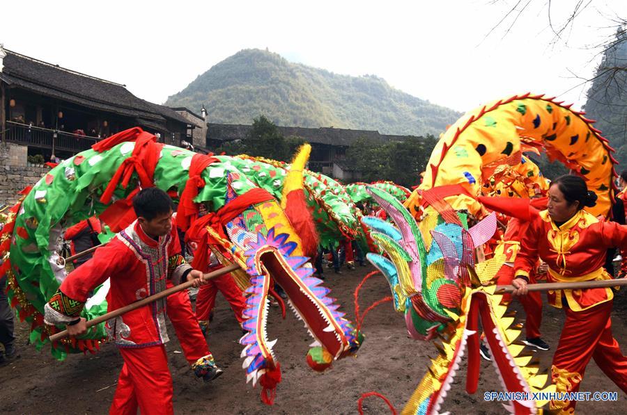 GUIZHOU, febrero 28, 2018 (Xinhua) -- Residentes interpretan la danza del dragón, en la antigua localidad de Zhaiying del Condado Autónomo Miao de Songtao, en Tongren, provincia de Guizhou, en el suroeste de China, el 28 de febrero de 2018. Un festival cultural de arte de la danza del dragón fue llevado a cabo el miércoles en el lugar. (Xinhua/Li Pingmao)