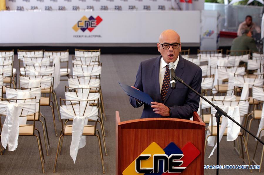 CARACAS, marzo 1, 2018 (Xinhua) -- El ministro de Comunicación e Información, en representación del Polo Patriótico, Jorge Rodríguez, participa durante una conferencia de prensa y firma del acuerdo de garantías electorales entre el gobierno y la oposición, en las instalaciones del Centro Nacional Electoral (CNE), en Caracas, capital de Venezuela, el 1 de marzo de 2018. Representantes del gobierno y de la oposición de Venezuela acordaron el jueves posponer la celebración de las elecciones presidenciales, programadas para el 22 de abril, para la segunda quincena de mayo y juntar los comicios legislativos estatales y municipales. Durante la firma de acuerdo de garantías electorales entre el gobierno y la oposición, realizada en la sede del CNE, se propuso el cambio de fecha para hacerlos de forma simultánea. "Se propone que se realicen de manera simultánea las elecciones en la segunda quincena del mes de mayo del 2018", se?aló el texto que fue leído delante de la presidenta del CNE, Tibisay Lucena. El acuerdo, firmado por los partidos políticos que respaldan al presidente venezolano, Nicolás Maduro, y al candidato opositor Henri Falcón, busca garantizar los derechos electorales y rechaza la violencia como política para avanzar en la reconciliación. El acuerdo fue firmado en la sede del organismo comicial por los dirigentes políticos Luis Augusto Romero, de Avanzada Progresista (AP); Felipe Mujica, del Movimiento al Socialismo (MAS); Miguel Salazar, de Copei, y Jorge Rodríguez, ministro de Comunicación e Información, en representación del Polo Patriótico. (Xinhua/Boris Vergara)